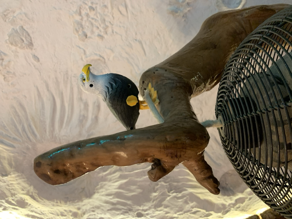 A gray and white cockatoo figurine with a yellow crest perches on a brown, glossy branch. The branch extends from a larger, tree-like structure with visible knots and textures. To the right, a round black fan with intricate grille patterns is positioned close to the branch. The background appears textured and light-colored, resembling uneven surfaces or an abstract landscape.