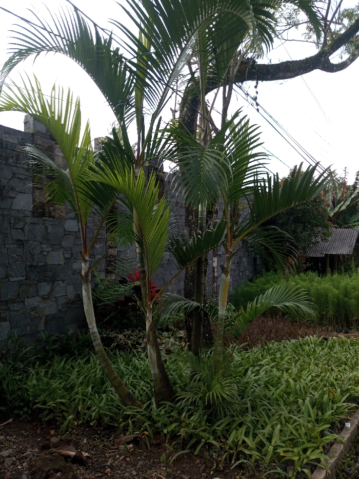 The image displays an outdoor scene in Sandamal Eliya, Sri Lanka, characterized by dense vegetation and a partial structural boundary under an overcast sky. In the midground, three young palm trees with slender, light-colored trunks and prominent green fronds stand upright. Immediately behind these palms on the left, a dark gray stone wall, constructed from irregular blocks, extends horizontally. A cluster of red-leafed foliage is visible between the central and left palms, against the wall. The foreground consists of dark soil with scattered organic debris. Moving into the midground, the ground is densely covered with various types of low-lying green plants, resembling grass or groundcover. To the right, beyond the palms and dense groundcover, a field of uniform green plants extends towards the background. In the far right background, a small, rustic structure with a corrugated metal roof is partially visible. The upper background features large, dark tree branches, some appearing moss-covered, against a bright white sky. Multiple thin utility wires are stretched across the upper right portion of the frame. No individuals, animals, or distinct human activities are depicted.