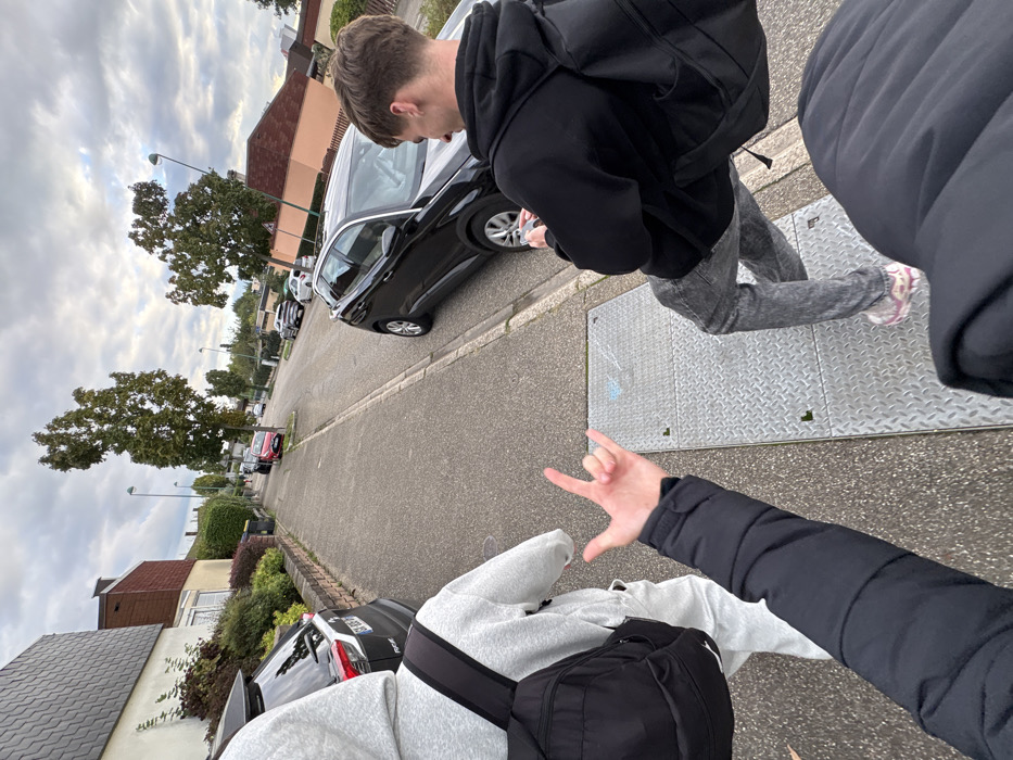 The image portrays a residential street scene in Hoenheim, France, under an overcast sky. Three individuals are visible on a paved sidewalk. In the immediate foreground, a person's left arm, clad in a dark-colored jacket, extends into the frame from the lower-left, with the hand displaying a "rock on" gesture. To the left, a second individual is seen from behind, wearing a light grey hooded tracksuit and a black backpack with white accents, walking forward. To the right, a third individual, male, is observed from behind, wearing a black hooded sweatshirt, faded grey jeans, and light-colored sneakers with pink and white soles, carrying a black backpack. This individual is positioned over three rectangular metal utility plates on the sidewalk and is actively looking at and interacting with a small electronic device, presumably a smartphone, held in both hands. The sidewalk runs parallel to a paved street where a black Peugeot 3008 SUV is parked on the right side, facing away from the camera. Additional parked vehicles, including a red car, are visible further down the street on both sides. Residential buildings with light-colored facades and reddish-brown tiled roofs line the street, with the properties on the left featuring dense green shrubbery and low walls. Trees with green foliage and streetlights are regularly spaced along the thoroughfare. The sky above is largely covered by grey and white clouds.