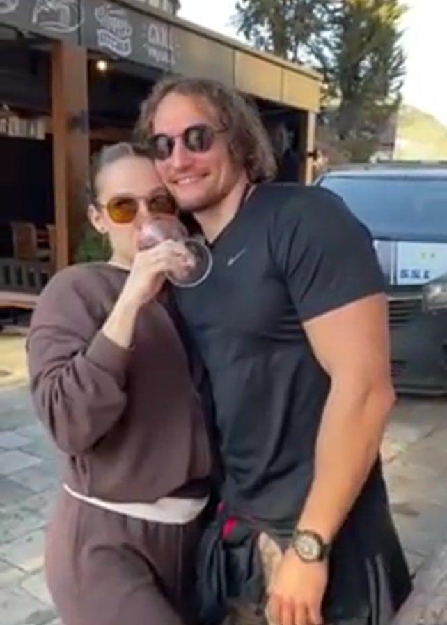 A light-skinned woman and man stand together outside. The woman has brown hair styled in a bun, brown sunglasses, and is wearing a brown sweat suit. She is holding a wine glass with a red liquid in it. The man has long brown hair, sunglasses, and is wearing a black t-shirt and camo pants. He also wears a watch on his left wrist. He puts his arm around the woman. The background features a building with a restaurant or cafe. A sign above says “Happy Kitchen Grill & More”. There is also a gray van parked nearby. They smile and pose for the camera. The man makes the "hang loose" hand gesture.