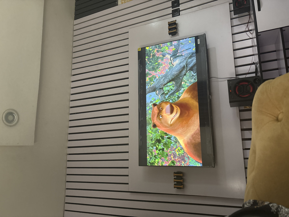 The image captures an indoor scene, likely a residential living area, located in Benin City, Nigeria. A large, flat-screen television is centrally mounted on a light-grey rectangular wall panel. The television displays an animated image of a large brown bear with a light-colored snout and a slight grin, set against a background of green foliage and a tree trunk. The wall behind the television is textured with vertical light-grey slats, which extend from floor to ceiling. To the left of the television, three small, golden, tiered decorative elements are vertically affixed to the wall. To the right, two black electrical outlets or switches are visible, alongside two black, tiered wall-mounted elements. Below the television, a black subwoofer with a prominent red illuminated circular grille and a smaller black satellite speaker are positioned on a multi-tiered media console or shelving unit featuring white and black sections. Interconnecting cables are visible behind and around the audio equipment. The ceiling is a plain off-white, with a single recessed downlight fixture visible in the upper-left quadrant. In the lower-left foreground, a segment of a tufted, mustard-yellow upholstered armchair is partially visible, with a black and white patterned fabric covering a portion of its armrest. No human figures are depicted.