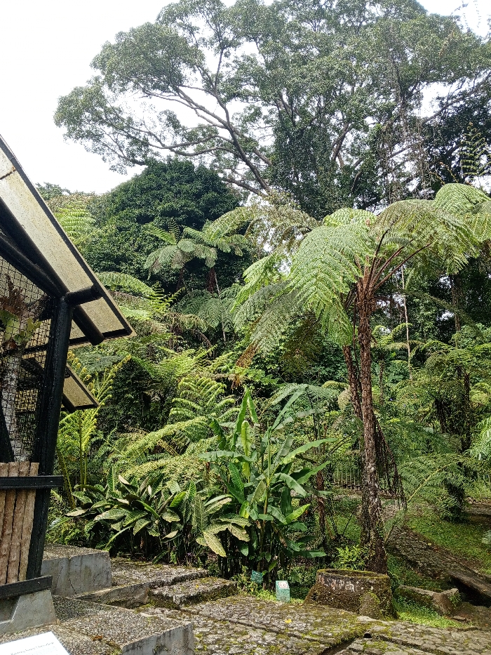 The image displays a densely vegetated, tropical landscape, identified as a section within the Ba Na Hills mountain resort area, located in Đà Nẵng, Vietnam. In the lower left foreground, a partial view of a man-made structure is visible, featuring a dark-colored metal frame, translucent roof panels, and a wire mesh side. Below this, vertical wooden slats are present. The immediate foreground consists of an uneven pathway or steps constructed from irregular stone or concrete blocks, heavily covered with green moss and lichen. The midground and background are dominated by lush, green flora characteristic of a tropical environment. Several prominent tree ferns with large, arching, frond-like leaves are scattered throughout. Clusters of broad-leafed plants, resembling banana plants, grow in the midground. The ground is thickly covered with various ferns, low-lying plants, and green foliage. A small, light green rectangular marker is visible among these plants. Towards the right, a moss-covered tree stump or cut log is present, along with a fallen log or elongated concrete element partially obscured by vegetation. The background features large, mature trees with substantial trunks and dense canopies, extending high into the frame against an overcast, light grey sky, indicating diffused lighting conditions. No people or active subjects are visible in the scene.