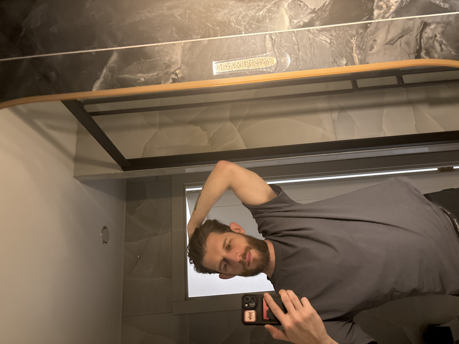 A man stands in front of a bathroom mirror, holding a phone to take a picture. He has brown hair, a beard, and is wearing a gray shirt. The bathroom features gray marble walls, a black-framed mirror with a wooden accent, and a decorative vial filled with seeds.