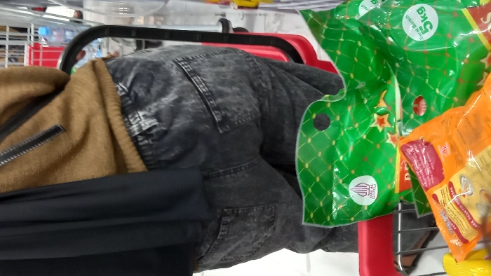 A shopping cart contains groceries and clothing. The groceries consist of a green bag labeled "5 KG" and an orange package. Clothing items include a black shirt, a tan jacket with a zipper, and a pair of dark-wash jeans. The cart has red trim and is partially obscured by the items within. The scene appears to be inside a store.