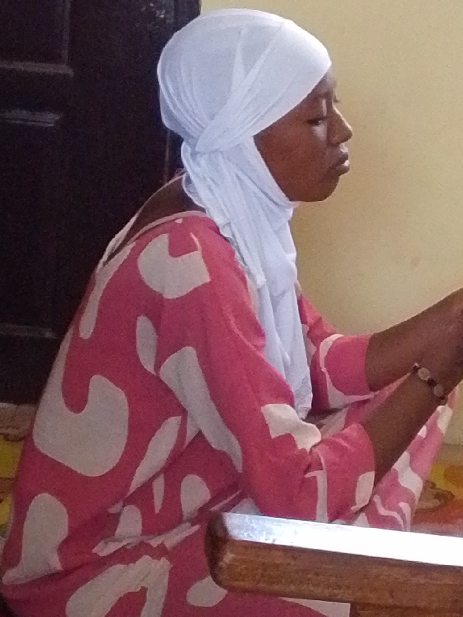 An individual is depicted in a right profile view within an indoor setting in Dungu, Ghana. The subject is a female, appearing young, with dark skin, wearing a white headscarf covering her head and neck. She is dressed in a long-sleeved, pink garment adorned with large, irregular white patterns. A dark-colored bracelet with multiple light-colored, possibly disc-shaped, elements is visible on her right wrist. Her right arm is bent at the elbow, with the forearm extending forward and slightly downward, out of the primary frame. Her lips are lightly pursed, and her gaze is directed forward and slightly downward. The background behind her head and upper back is a dark, possibly wooden, vertical surface. To her front and right, a plain, light yellow-beige wall is visible. In the lower right foreground, a portion of a wooden structure with a light-colored top edge, possibly a desk or table, is present.