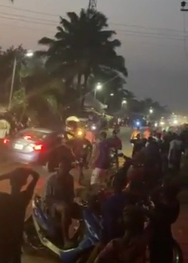 crowd of people gathered near a road at dusk. There are several motorcycles and a few cars visible, including one with its brake lights on. A three-wheeled vehicle moves along the road. Palm trees and other vegetation are present. The sky is overcast. Some of the people in the crowd are walking, while others are standing or sitting on motorcycles. The overall atmosphere appears lively, but the exact nature of the gathering is not clear from the video.
