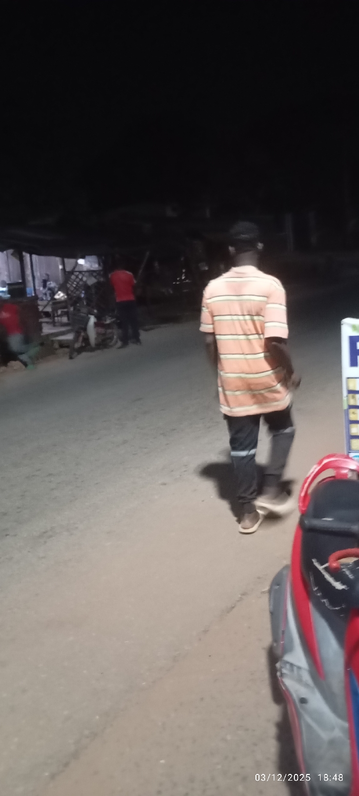 At night, a person in a horizontally striped shirt walks away on a road. Behind him are other individuals near what appears to be a street-side establishment, with a motorcycle parked. The road is asphalt. A red scooter is partially visible in the foreground. The photo's timestamp indicates March 12, 2025, at 18:48.