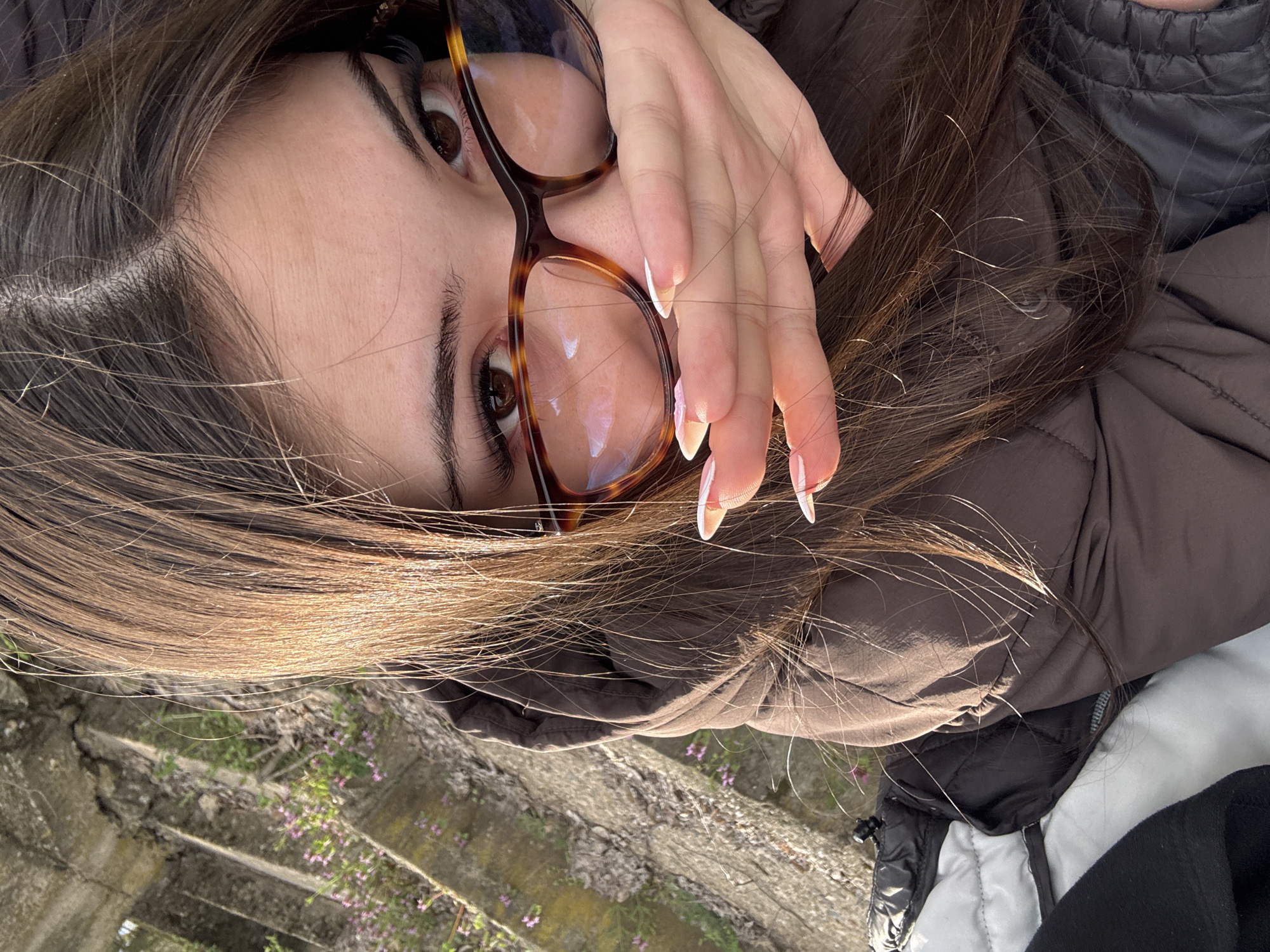 A young woman with long brown hair and brown eyes is angled in the frame. She wears glasses with tortoise-shell frames. Her hand is raised near her face, displaying long, pale fingernails with white tips. She wears a brown jacket. The background shows a weathered stone structure with green grass and small purple flowers, suggesting a potentially historical or old outdoor setting. The image is taken from a tilted perspective. There is no indication of the specific location in Gromshin, Bulgaria.