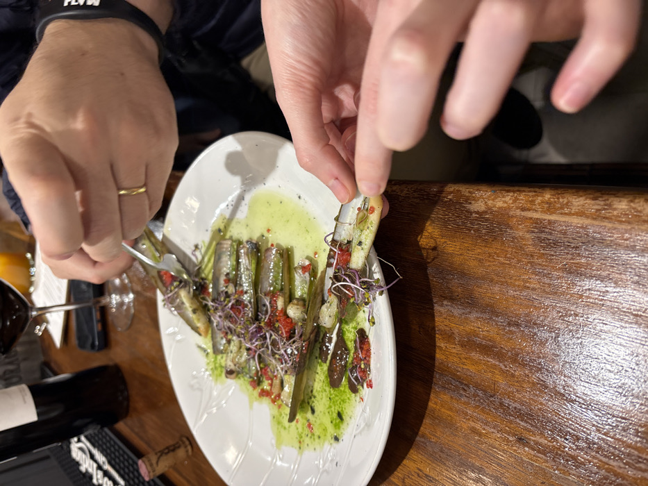 A white plate presents a dish of razor clams garnished with red caviar and sprouts. A green sauce pools around the clams. Two hands manipulate the food; one uses small tongs, while the other picks up a clam with bare fingers. A gold wedding band is visible on the hand holding the tongs. A wine glass, bottle, and a black object are partially visible on the wooden table next to the plate.