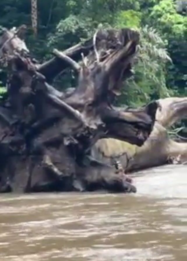 large tree root structure in a river, surrounded by lush green vegetation. As the camera pans to the right, an inflatable raft with people wearing life jackets appears, navigating the rapid current.
