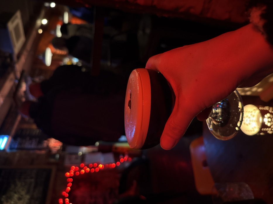 A hand holding a glass filled with a dark liquid is viewed from an unusual angle. The hand is bathed in red light, as is the rim of the glass. The glass base is visible, reflecting the light from nearby lamps. In the background, a series of blurred red lights are strung across a dark, partially obscured scene. This suggests a festive or decorative setting, though the details are indistinct.