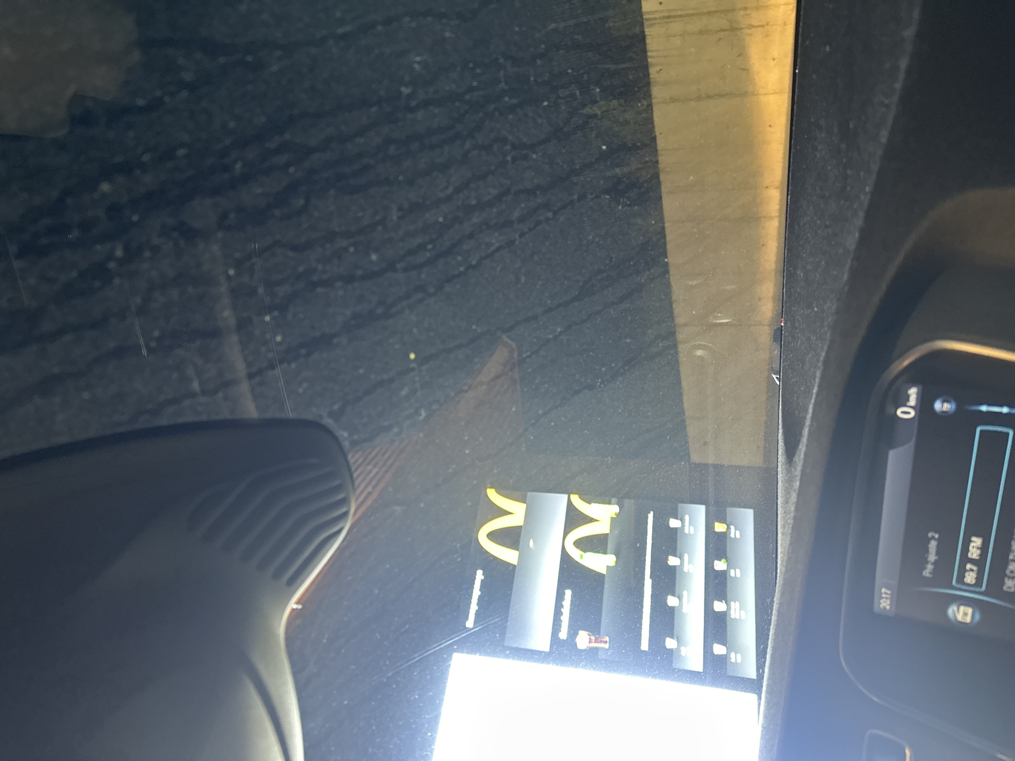 The image depicts the interior of a stationary vehicle looking outward through a heavily soiled windshield during the evening. The lower portion of the frame shows the vehicle's dark dashboard, with a prominent infotainment screen in the lower-left corner displaying "20:17" (time), "0 km/h" (speed), and "89.7 RFM" (a radio frequency, consistent with Portuguese broadcasting). In the upper-center, a black plastic component, possibly an air vent or sensor housing, is visible. Beyond the windshield, to the left, a brightly illuminated digital McDonald's drive-thru menu board is visible, displaying the iconic golden "M" arches twice, vertically stacked. Below these, rows of beverage icons (cups with straws, coffee cups) are presented. The exterior on the right is dark and indistinct, with horizontal light-colored banding at its base. The scene takes place at a McDonald's drive-thru located at Rua da Cruz d'Areia 180, 4800-410 Guimarães, Portugal. No individuals are visible. The vehicle is static, facing the menu board, indicating an ordering process is underway.