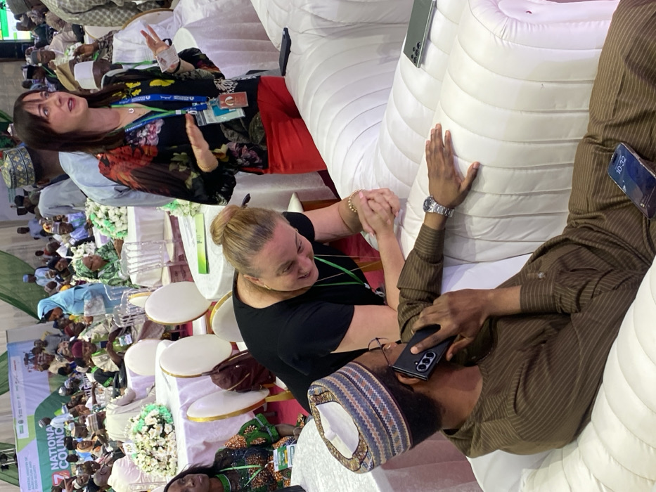 An indoor scene in Unguwar Sarki, Nigeria, depicts a crowded conference or council meeting. In the foreground, a man wearing a brown striped traditional Nigerian outfit and a patterned Kufi cap reclines on a white upholstered sofa. He holds a black smartphone to his right ear, engaged in a call. A silver wristwatch is visible on his left wrist, and another silver smartphone, displaying "10:32," rests beside him on the sofa. To his left, a blonde woman in a black top and green lanyard leans over the sofa, smiling downward with clasped hands. Behind her, a brunette woman with dark hair stands, gesturing with open hands as if speaking. She wears a floral black blouse, red pants, and multiple identification badges on lanyards. The background features numerous attendees seated at round tables draped in white tablecloths and adorned with white and green floral centerpieces. Many individuals in the background are dressed in traditional Nigerian attire, including Kufi caps and hijabs. A partial banner displaying "NATIONAL COUNCIL" and "FEDERAL MINISTRY OF AGRICULTURE AND FOOD SECURITY" is visible in the upper left background, indicating the nature of the event.