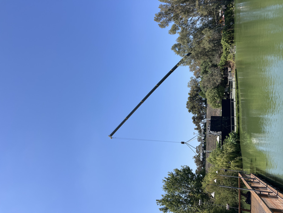 A long black crane arm extends across a cloudless blue sky. Below, a complicated structure sits near the edge of a murky green river or pond. Trees line the riverbank, with glimpses of a building structure nestled within. A wooden walkway or pier extends toward the bottom edge of the frame, with streetlights lining its side. The scene has a bright, daytime feel.
