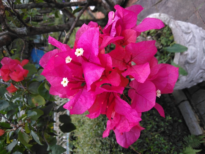 The image displays a close-up, vertical view of a vibrant fuchsia-pink bougainvillea plant in an outdoor setting, reportedly located in Phou Khoun, Laos. The central subject is a cluster of fuchsia-colored bracts, each exhibiting visible veins and a slightly textured surface. Three small, white, star-shaped true flowers with yellow centers are clearly visible within the upper part of the main bract cluster, and a fourth is partially visible below. The bougainvillea is contained within a light grey, decorative pot featuring raised, ornate scrollwork patterns, situated in the lower right. Green foliage is present both within the pot and immediately surrounding its base. The ground beneath the pot consists of light grey, possibly rectangular, pavers. In the blurred background and midground, green foliage from other plants and tree branches is visible. To the upper left, a faint, light-colored, possibly white, lattice-like structure or railing is discernible through the vegetation. To the upper right, behind the main flower cluster, a dark blue, indeterminate object is present. A gnarled tree branch or trunk is visible further right, and smaller clusters of red bougainvillea or similar flowers are present in the upper right background. No individuals are depicted in the scene.