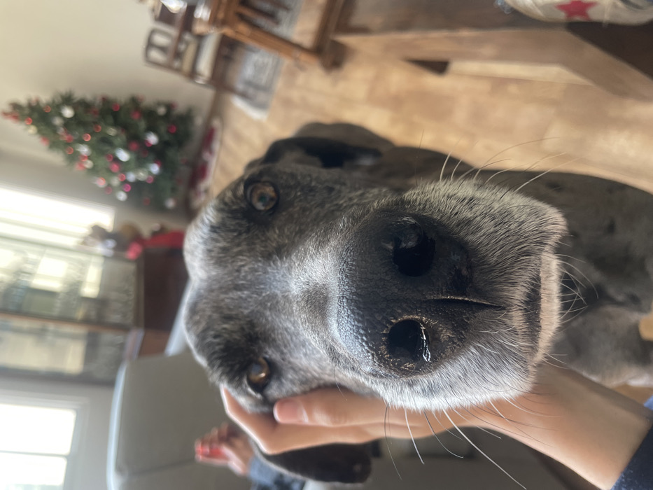 A close-up shot of a gray dog's face dominates the frame. The dog's nose is large and black with a droplet of liquid. The dog's eyes are brown, and some white whiskers surround its muzzle. The dog is being held by a human hand. Out of focus in the background are interior elements: a Christmas tree, a chair, a window, and a piece of furniture. The photo is taken from an upside-down angle, giving a unique perspective.