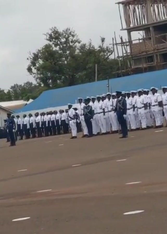 two groups of military personnel standing in formation on a large asphalt ground. On the left side, the group is dressed in khaki uniforms, while on the right side, they are in white naval uniforms. In the foreground, a man in a black shirt and pants walks toward the camera while holding a DSLR camera in his right hand. In the background, there is a building under construction with scaffolding visible. Other buildings and trees are also present. The sky is overcast and gray. The ground has painted white lines marking the formation areas. Military commands are audible in the background.