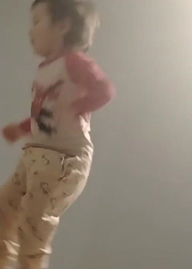 A young child in pajamas stands on a bed covered with a patterned comforter. The child jumps up and down a few times before briefly sitting. The camera is positioned low, looking up at the child. The background shows a plain wall, a corner of curtains, and a bedside lamp. The lighting is soft and somewhat diffuse.
