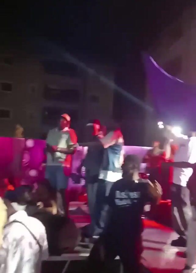 group of people on a stage at an outdoor event, with a crowd watching from below. The people on stage are dancing and gesturing, some holding microphones or flags. The stage is decorated with colorful lights and backdrops, featuring the word "SAVE". The crowd is also moving and dancing to the music, appearing to enjoy the performance. The event seems to be taking place at night, with buildings visible in the background. The video is shot from within the crowd, giving a view of the stage and the surrounding atmosphere.