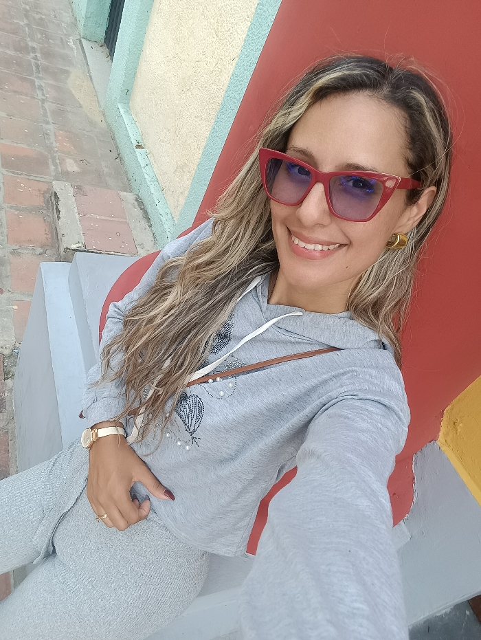 A woman poses for a selfie outdoors, wearing red sunglasses and a gray hoodie with beaded embellishments. She has long, wavy blonde hair and gold earrings. A gold watch adorns her left wrist, and a gold ring is on her finger. The background features a colorful wall painted in red, yellow, light blue, and cream. A brick surface is visible in the upper left corner.
