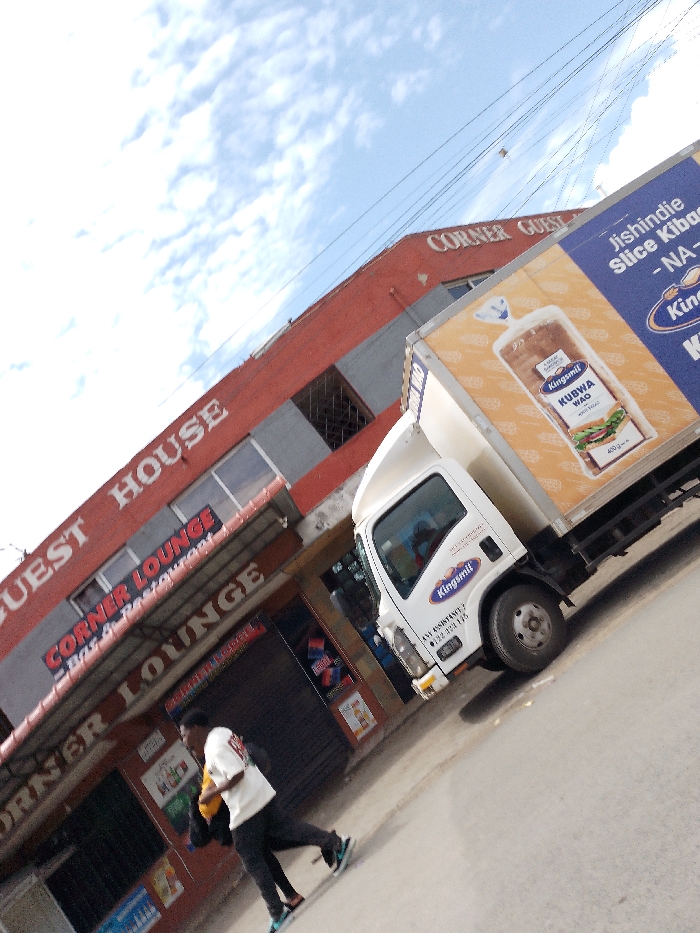 The image displays a street scene in Nakuru, Kenya, under a partly cloudy blue sky. A two-story building, painted red with grey accents, occupies the left side, featuring "CORNER GUEST HOUSE" in white lettering on the upper level and "CORNER LOUNGE Bar & Restaurant" on the ground floor. The ground floor exhibits a closed dark roller shutter and various beverage advertisements on a storefront. Positioned centrally and to the right, a white commercial delivery truck, branded "Kingsmil," displays large advertisements for bread products on its cargo box, including "Kingsmil Kubwa Wao" and a contact number "222 423 113." A ladder is visible on the truck's side. A lone individual, dressed in a light-colored short-sleeved shirt, dark trousers, and light-colored sneakers with blue accents, walks from left to right across the lower frame, carrying a yellow object and a dark bag. Overhead utility lines crisscross the upper sky. The street surface is light grey.