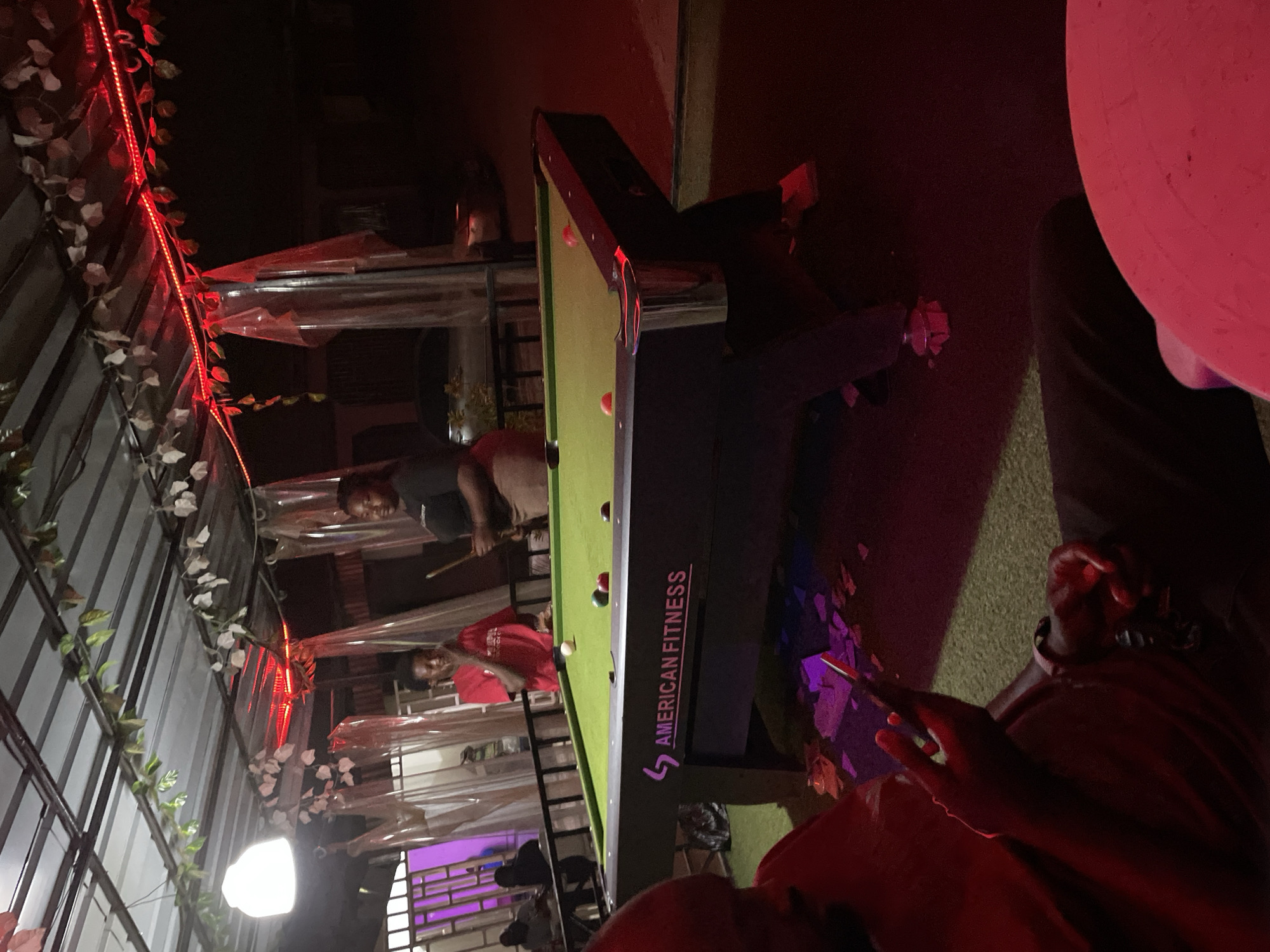 Here's a matter-of-fact description of the image: The image depicts an outdoor setting in what appears to be a recreational area in Barakin Akawo, Nigeria. The scene centers around an "American Fitness" branded pool table, on which several pool balls are placed. Two individuals are actively engaged in playing pool. One wears a red shirt and is positioned near the table, presumably taking a shot. The other, wearing a dark shirt, stands further away. A third person is visible in the foreground, seated and looking at their phone. The area is partially covered by a structure, possibly a patio or pergola, decorated with artificial vines and red string lights. The lighting is dim, primarily illuminated by overhead lights. Other individuals are also present in the area.