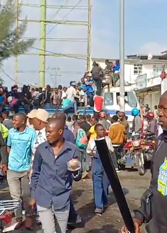 crowd of people in an outdoor area. The majority of the people appear to be men, and they are dressed in casual clothing. Some are wearing hats and jackets. There is a truck with people standing in the back of it. A man is sitting on a red motorcycle in the foreground. There is a tall metal structure in the background, along with some buildings and trees. The sky is bright and clear. Some of the people appear to be talking, and there is a general sense of activity and movement in the scene.