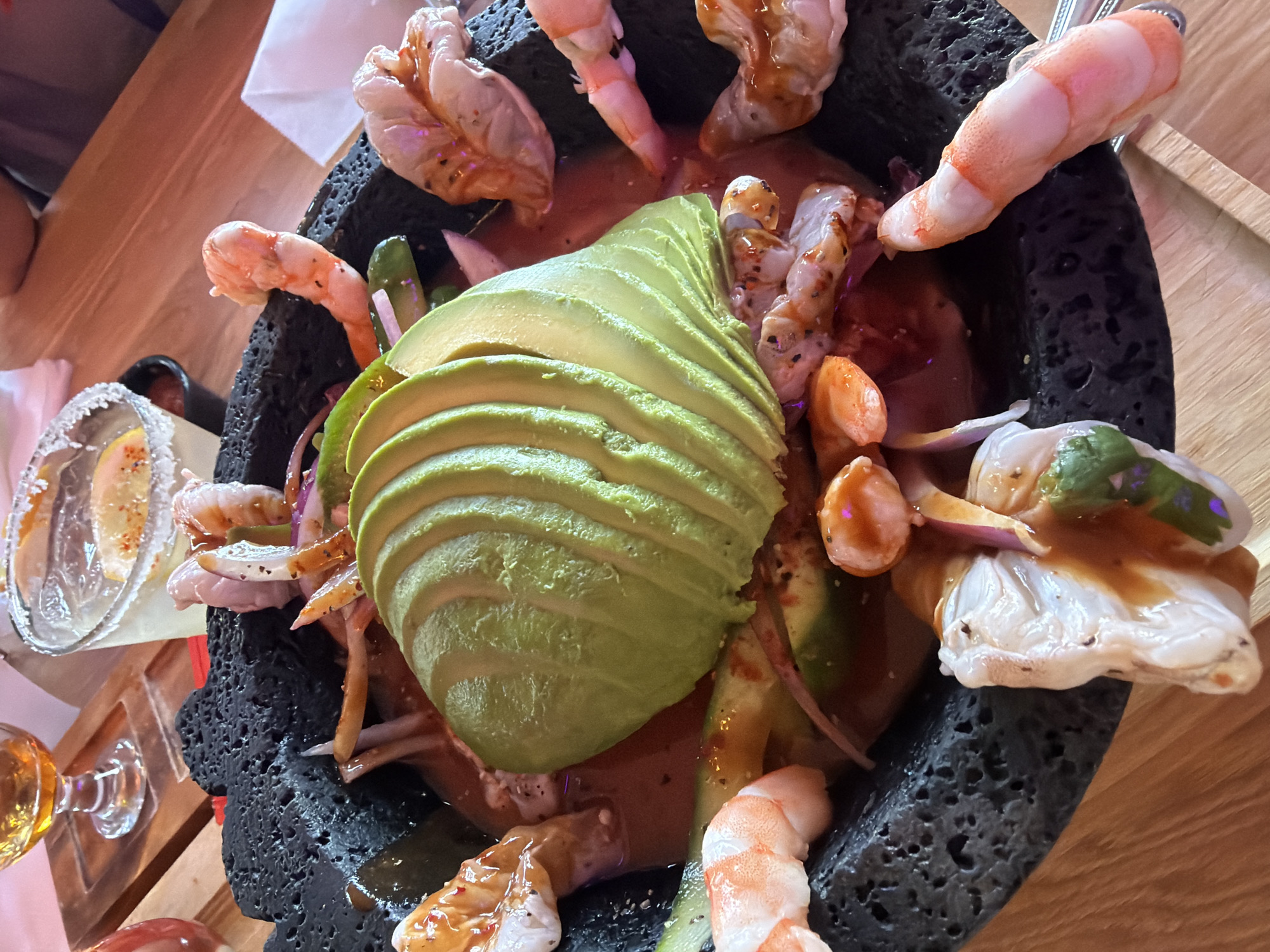 molcajete dish with shrimp and avocado, likely a seafood cocktail, set on a wooden table