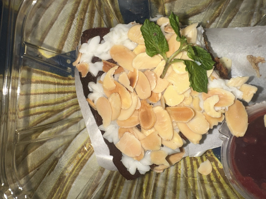 A rectangular slice of what looks to be cake is served in a plastic container. The cake itself is chocolate brown with white frosting dolloped on top. Sliced almonds generously cover the frosting, creating a visually appealing texture. A sprig of fresh mint rests among the almonds as an accent. Next to the cake, a small container holds a red sauce, likely a berry compote, completing the presentation. The container sits on a surface with a geometric pattern.
