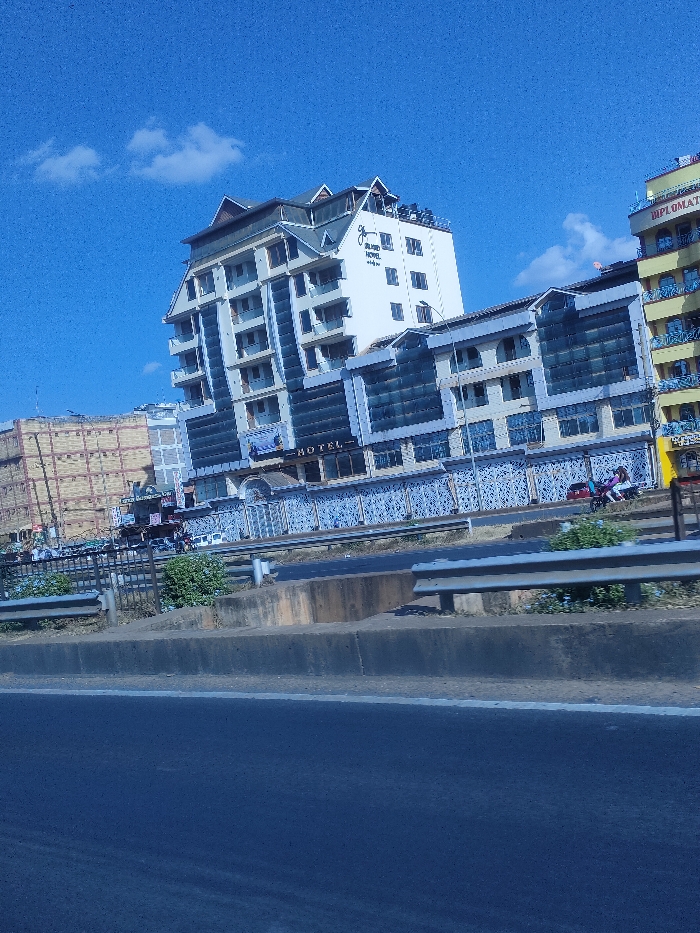 A tall, modern hotel complex stands beside a road. The building features a mix of white sections with many windows and a taller section with balconies. The word "HOTEL" is visible above the entrance. A few other buildings are seen in the background, and there's a guardrail separating the road from the hotel. The sky is bright blue with a few clouds.