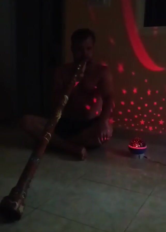 A man sits cross-legged on a tiled floor in a dimly lit room, playing a didgeridoo. He is shirtless and appears to be wearing shorts. The didgeridoo is long and decorated with an array of colors and patterns. To his right is a small, round, rotating light projector casting various colored stars and shapes on the wall behind him. The room seems simple, with the wall being a neutral color and a glimpse of a closed dark doorway on the left. The primary actions involve the man playing the didgeridoo, creating a distinct sound, while the light projector adds a colorful, dynamic element to the otherwise dim setting.