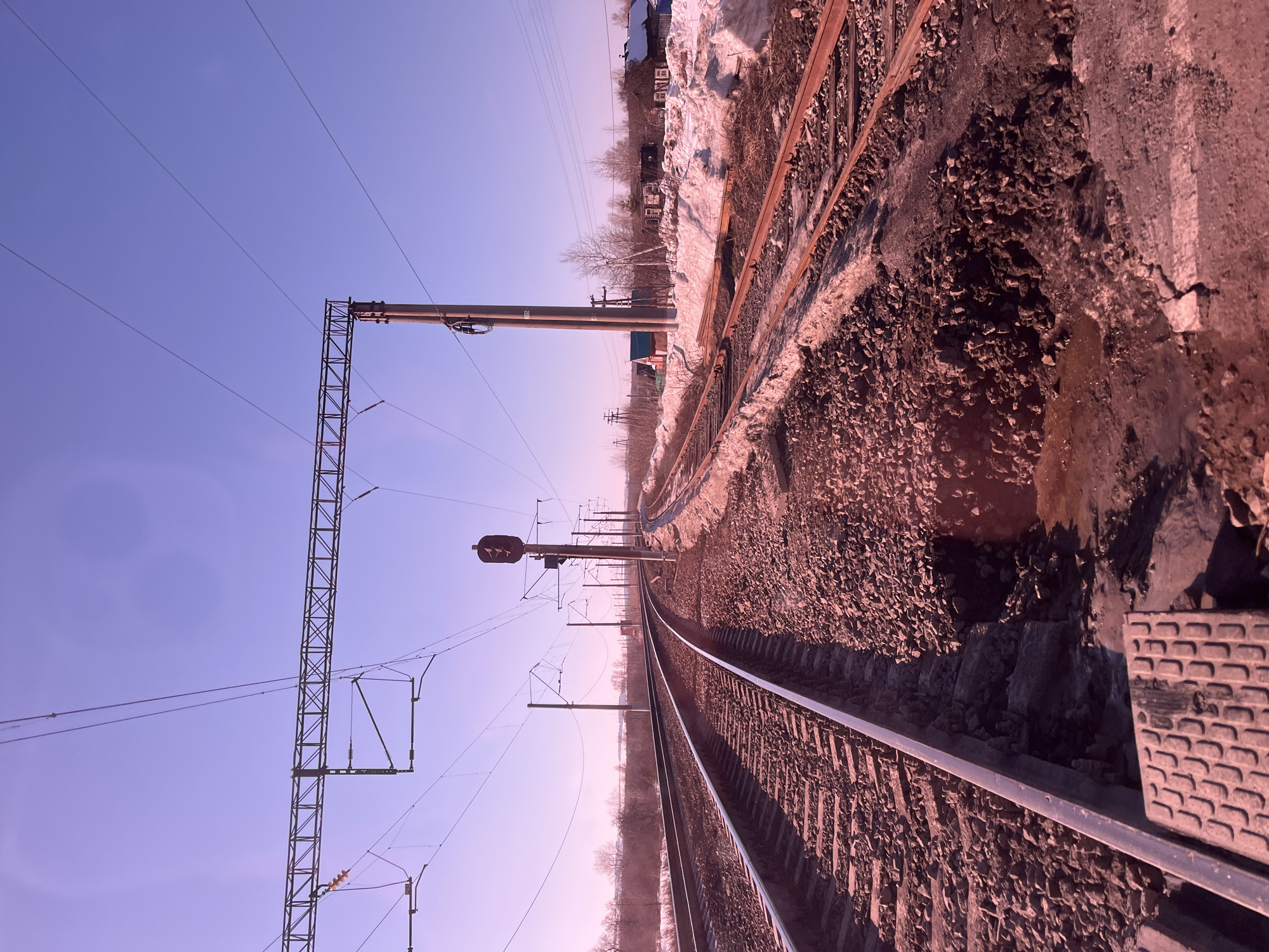 The image displays a railway scene in Kambarka, Russia, under a clear sky with a prominent pink-purple chromatic cast. Multiple sets of railway tracks, laid on ballast, extend from the foreground into the midground. The primary double track curves gently to the right as it recedes into the distance. To the right of the main tracks, a diverging set of tracks is partially obscured by piles of snow and dirt. Overhead, an intricate network of catenary electrical lines is visible, supported by a metal truss structure spanning the tracks and a series of concrete utility poles. A tall utility pole stands prominently in the midground, to the right of the main tracks, supporting additional wires. Further right, a dark, vertical railway signal pole with what appears to be a three-aspect signal head is present. The ground immediately surrounding the tracks features accumulated piles of melting snow, dirt, and muddy puddles, indicating a transition from winter. In the immediate foreground, a rectangular metal grate or utility cover is visible on the ground, partially cracked. In the background, a sparse treeline composed of bare deciduous trees stretches across the horizon. To the far right, beyond the snow piles, several modest, possibly wooden, residential structures are partially visible, some with snow on their roofs, consistent with a semi-rural settlement. No individuals or active subjects are present in the scene.