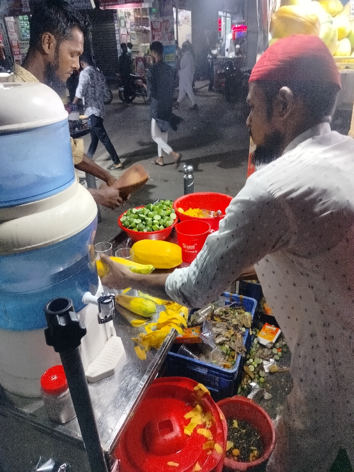 Two men are preparing a street food stand on a busy sidewalk in Charfasson Sadar, Bangladesh. One man, wearing a red cap, is peeling a mango, while the other man is preparing fruit in a bowl. Both are wearing white shirts. The man in the red cap is standing on the right side of the image, while the other man is on the left. The man in the red cap is using his right hand to peel the mango. The man on the left has a large blue and white water dispenser. The man on the left is using his right hand to place a piece of fruit into the bowl. Both men are standing in front of a metal table that has several bowls of fruit, including lemons and mangoes. The table is covered in mango peelings and other food debris. The stand is located in a busy street, surrounded by buildings and people. The street is narrow and crowded, with a lot of foot traffic. There are several cars and motorcycles parked on the side of the street. The scene is brightly lit, and the weather is pleasant. The stand is located in a busy street, surrounded by buildings and people. The street is narrow and crowded, with a lot of foot traffic. There are several cars and motorcycles parked on the side of the street. The scene is brightly lit, and the weather is pleasant.