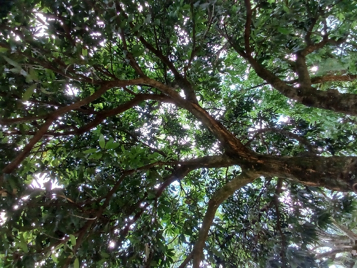 A low-angle shot looks up into a dense tree canopy. Thick, brown branches intertwine, partially obscuring glimpses of the bright sky. Lush green leaves fill the spaces between the branches, creating a textured, layered effect. Sunlight filters through the foliage, adding highlights and depth to the image. The composition emphasizes the height and density of the tree.