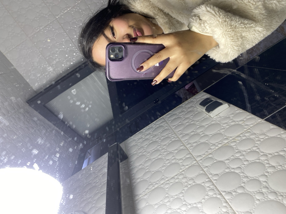 A person takes a selfie in a bathroom mirror, holding a purple phone. The person has dark hair and is wearing a white, fuzzy jacket. The bathroom has white, textured tiles with a circular pattern. The mirror is framed in black. The bathroom vanity is dark, contrasting with the lighter tiles. There appears to be soap or a dispenser on the countertop. A light source is visible in the lower-left corner.