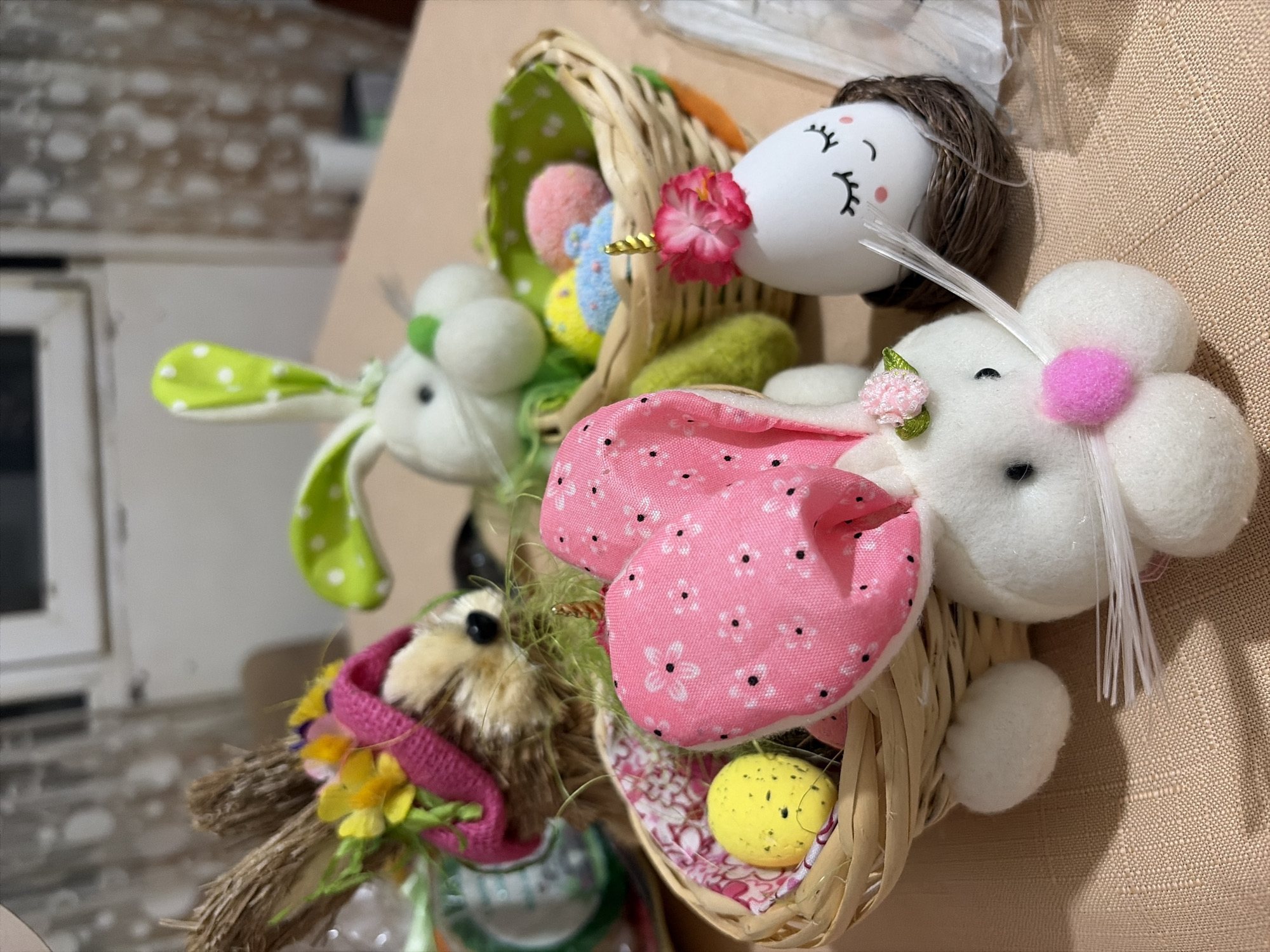 close-up of several Easter-themed decorative items arranged on a surface. The items include: - A white rabbit with green polka-dot ears peeking out from behind a basket. - A basket containing colorful Easter eggs and green decorative straw. - A white egg decorated as a unicorn with brown hair, closed eyelashes, a pink flower "horn," and rosy cheeks. - Another white rabbit figure with a pink flower on its head and a pink bow. - A straw-like animal figure with a pink scarf and yellow flowers. Given the subject matter, the image likely depicts a festive Easter decoration, possibly photographed indoors. The location in Ruse, Bulgaria is not discernible from the image. There are no people visible, only inanimate objects. The objects are arranged on a beige surface with a woven texture. The background shows glimpses of a window and a shelf or wall with brick-like patterns, further suggesting an indoor environment.