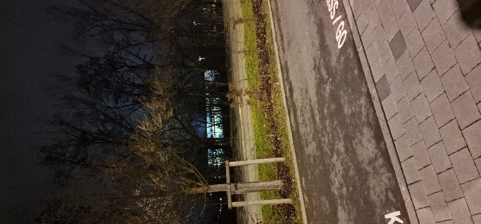An outdoor shot at dusk reveals a stark contrast between dark trees and a building with bright, glowing windows. The ground transitions from a grassy strip to a dark, possibly wet pavement and then to cobblestones. The pavement has painted white markings. Wooden structures are seen near the grassy area, possibly part of a landscape design or barrier. The overall impression is a blend of natural and urban elements under low lighting.