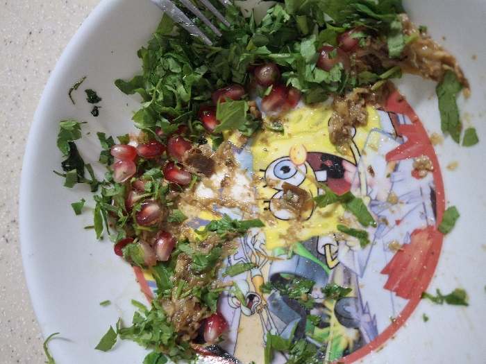 - "A white, partially cleared bowl with a Spongebob Squarepants cartoon design at its base contains remnants of a meal, featuring a brownish, pasty substance, scattered bright green chopped herbs (likely parsley or cilantro), and numerous translucent red pomegranate seeds" by FM-niJg42, licensed under CC BY 4.0