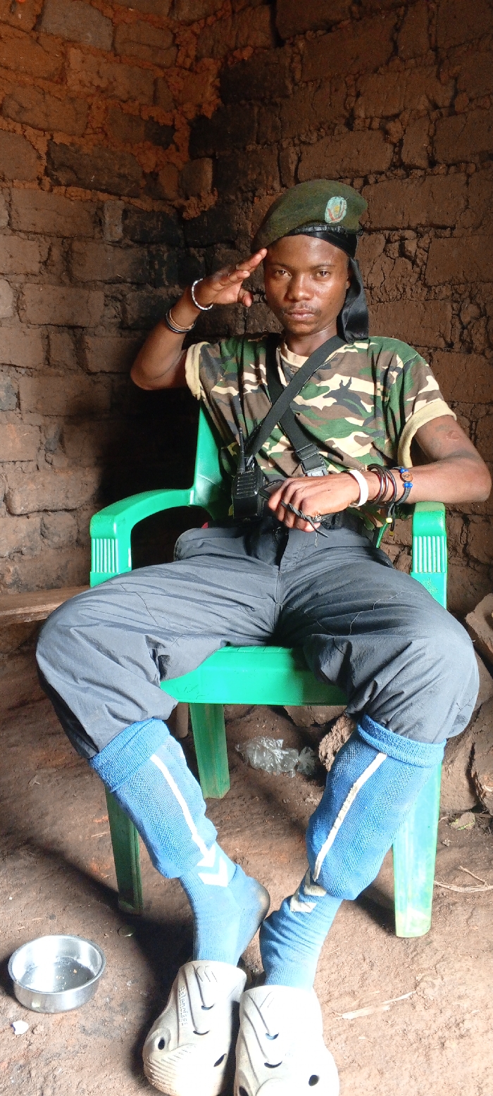 An individual, identified as male, is depicted seated on a green plastic chair indoors in Kundu 1, Democratic Republic of the Congo. The subject, a young adult with dark skin, wears a dark green beret with an emblem, a black fabric head wrap, a camouflage short-sleeved t-shirt, dark grey trousers, long blue socks with white stripe patterns, and light grey open-toed sandals. A black shoulder harness supports a two-way radio attached to the subject's left chest. Multiple bracelets are present on both wrists, and a tattoo is visible on the inner right forearm. The subject's right hand is raised in a salute, while the left hand rests on the lap, holding a dark, twisted object. The background consists of a rough, unplastered wall constructed from mud bricks or irregular bricks with visible mortar. The floor is dirt, where a small silver metal bowl containing liquid or residue is positioned to the lower left, and a crumpled clear plastic bag is visible near the subject's right foot. The subject maintains direct eye contact with the camera.