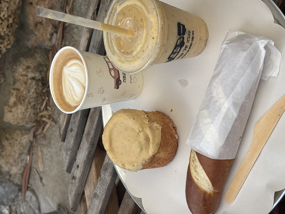 The image depicts an outdoor table setting at a cafe identified as "Coffee Wheels" (קפה גלגלים / Ha'Agala shel Kafe Galgalim), located in Kfar Vitkin, Israel