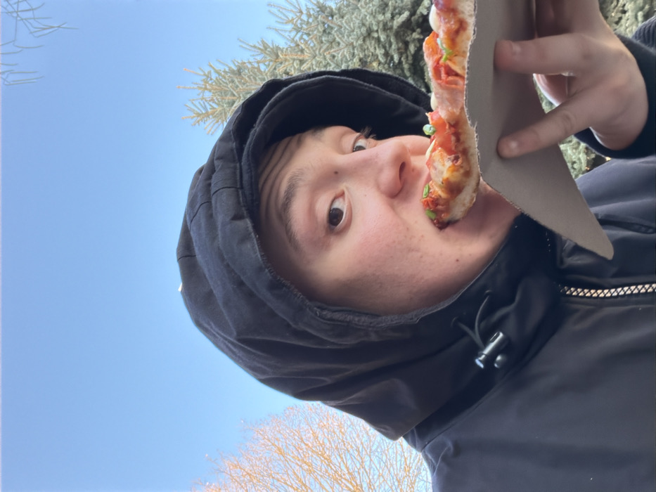 An individual is depicted outdoors in Ravda, Bulgaria, consuming a slice of pizza