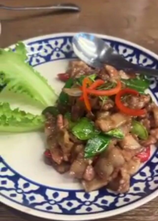 spread of dishes on a wooden table in a restaurant setting. A plate with stir-fried pork belly, garnished with green peppers, red chili rings, and lettuce, is visible. A white plate of plain rice sits next to it. Another tray holds small, yellow fried dumplings tied with a string, accompanied by a small bowl of red dipping sauce. A fork and spoon are placed near the plates, indicating that someone is about to eat. The table is simply decorated, and another person's arm is partially visible in the background, suggesting a shared dining experience.
