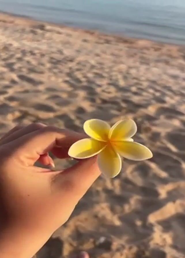 A hand holds a yellow and white plumeria flower against a sandy beach backdrop with the ocean visible in the background