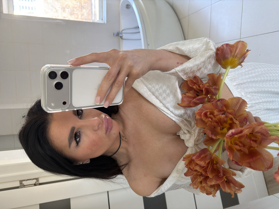 A female subject is captured in a mirror selfie within a modern bathroom environment. She possesses long, dark hair and is wearing a light-colored, off-the-shoulder blouse with a subtle pattern, tied at the front, revealing her décolletage. Her facial features include prominent winged eyeliner, defined eyebrows, and full, glossy lips. She wears small silver stud earrings and a black choker necklace with a small golden cross pendant. A small red symbol tattoo is visible on the inside of her right wrist. The subject's left hand holds a silver-colored smartphone, encased in clear material, which reflects her image. Her right hand clutches a bouquet of approximately seven to eight fully open, ruffled tulips in shades of orange and yellow. Her expression involves a slight puckering of the lips as she looks towards the phone's camera reflection. Her fingernails are manicured in a French tip style. The background, visible as a mirror reflection, shows a clean, well-lit bathroom. Key elements include a white, freestanding oval bathtub with a chrome faucet system, positioned below a window fitted with white horizontal blinds. The walls are tiled, with a section on the far left featuring a black and white striped pattern. The floor is composed of light-colored, possibly white, square tiles. A white door frame is partially visible on the left side of the reflection. The specific city of Voronezh, Russia, cannot be identified from the visual information presented in the image.