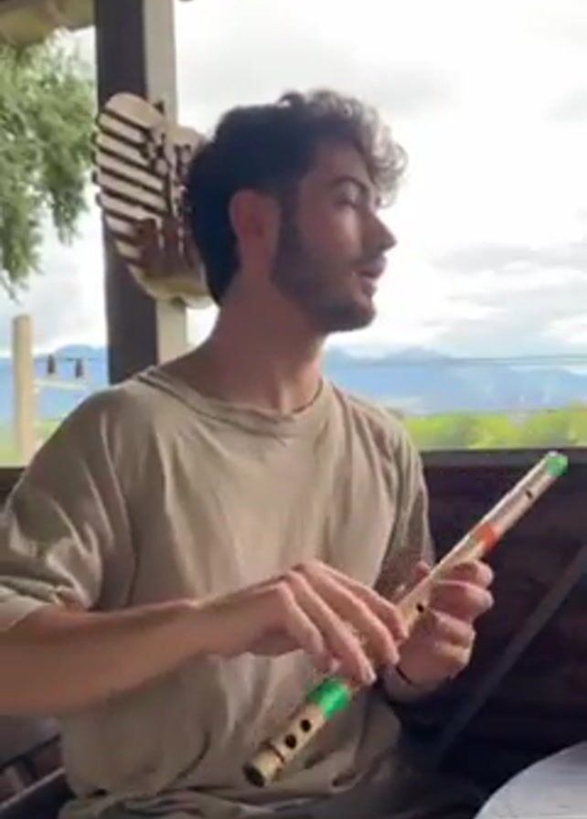 A young man with dark curly hair and a beard sits on a wooden bench indoors. He is wearing a light beige t-shirt and dark shorts. He holds a wooden flute with green markings near its ends and plays it. He then puts the flute down on a table, looks out the window, and rests his arm on the window frame. Outside the window, there is a view of a body of water, trees, and mountains under a cloudy sky. The man appears relaxed as he gazes at the view.