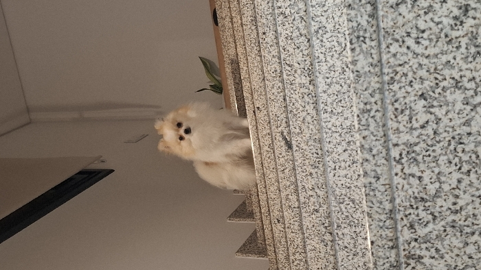 - "A fluffy, cream-colored Pomeranian dog peeks out from between the steps of a marble staircase" by FM-VH5CK2, licensed under CC BY 4.0