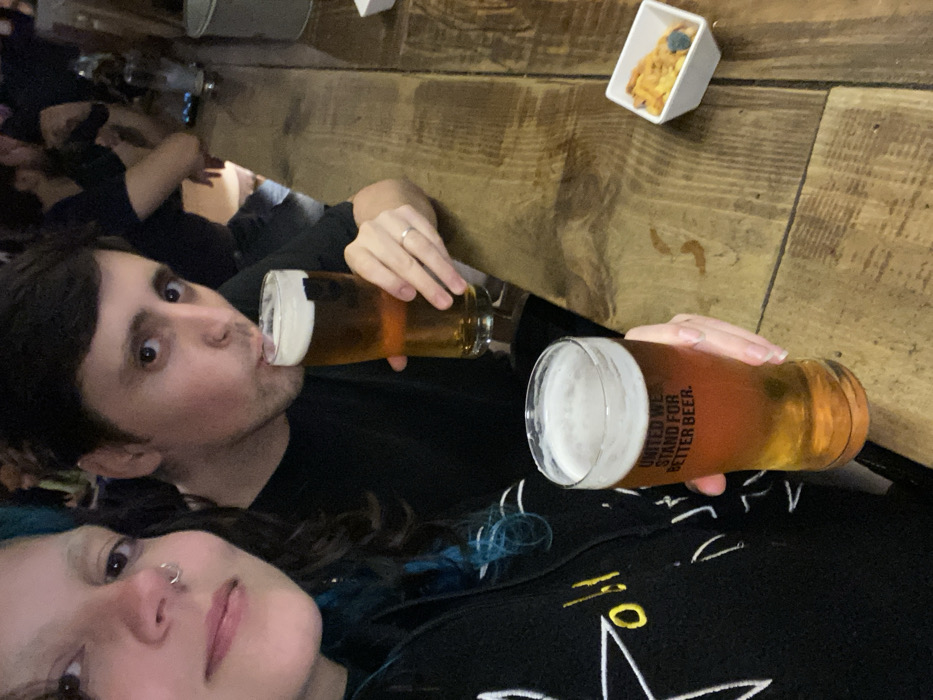 A selfie-style image shows a couple at a wooden table. The man drinks from a pint glass filled with beer, wearing a black t-shirt. He has short, dark hair and light skin. A woman with dark hair and a nose ring leans into the frame. She wears a black hoodie with a white design. Two full pints of beer sit on the table, along with a small white dish of snacks. Other people and drinks are visible in the background.