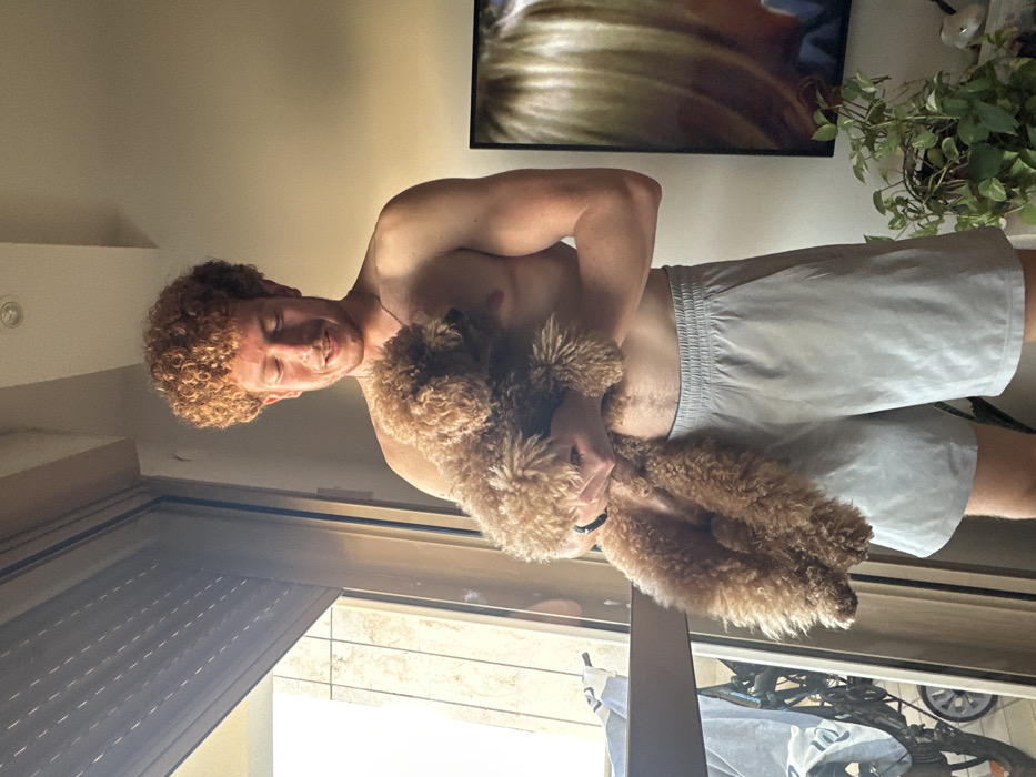 The scene is set indoors in Tel Aviv, Israel. An adult male with red curly hair and light facial hair stands shirtless, wearing light grey athletic shorts. He holds a small to medium-sized dog with brown, curly fur in his arms, looking down at it. The man wears a thin silver necklace and a black ring on his left ring finger. To the left, a large glass sliding door is partially open, with a grey roll-down shutter partially lowered from the top, revealing a balcony with a bicycle draped in a light-colored cloth and a light-colored building exterior. The interior wall on the right is light-colored, featuring a black-framed television displaying a close-up image of blonde hair. A potted plant with green leaves is positioned on a surface below the television. A recessed light fixture is visible in the ceiling.