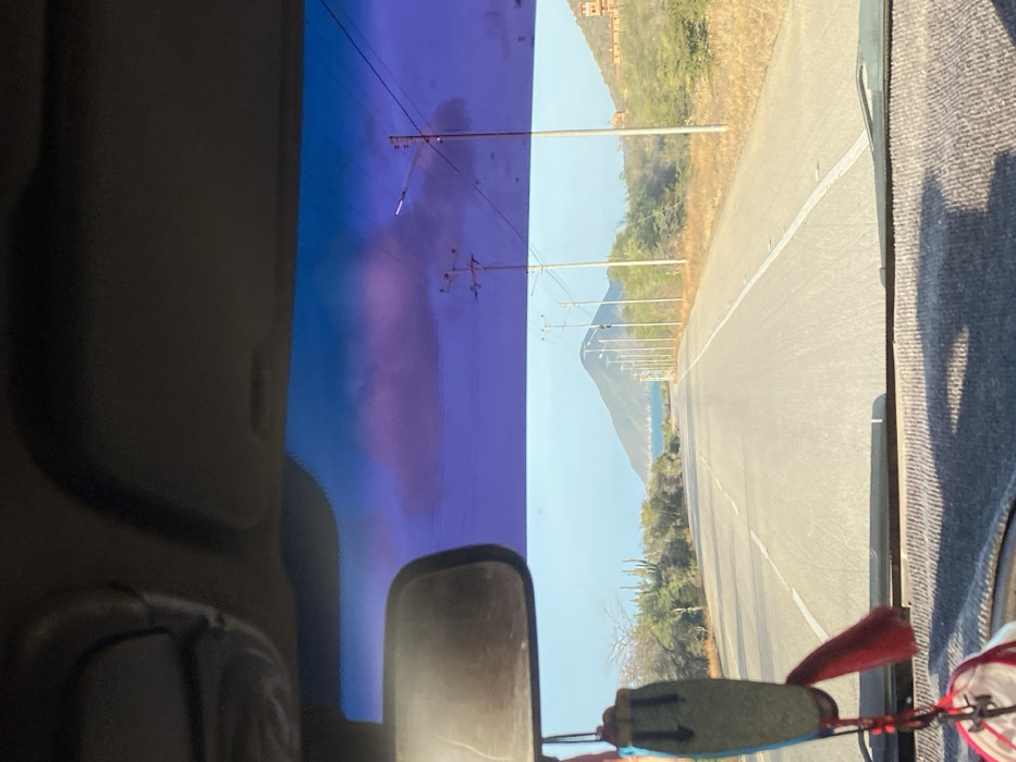 The image presents a forward-facing view from inside a vehicle on a paved road in La Guardia, Venezuela. The road is two-laned, marked with a solid white line on the right shoulder and a broken white line in the center, extending into the distance with a slight curve to the left. Arid coastal vegetation, including cacti and dry shrubs, borders both sides of the road. A series of utility poles with streetlights line the right side. In the mid-ground on the left, a body of water meets a prominent, cone-shaped mountain rising directly from the coastline. On the right, further up an incline, a large, multi-story building with reddish-brown walls and a distinctive tower is visible. The sky is clear blue at the horizon, gradually transitioning to a deep purple tint in the upper portion, likely due to a windshield visor or tint. A few faint, purple-tinged clouds are present in the upper sky. Inside the vehicle, the rearview mirror is visible in the upper-left, with a blue and red decorative item hanging from it. The top of the dashboard is visible at the bottom of the frame. No individuals are present.