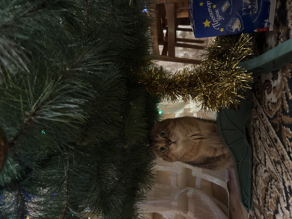 A tan and gray cat with wide, surprised eyes peers out from beneath a Christmas tree. The tree is decorated with gold tinsel and its branches obscure most of the cat. The base of the tree is visible, along with a box bearing Cyrillic text. A carpet with a repeating pattern covers the floor. The cat appears curious or startled, adding a whimsical touch to the scene.